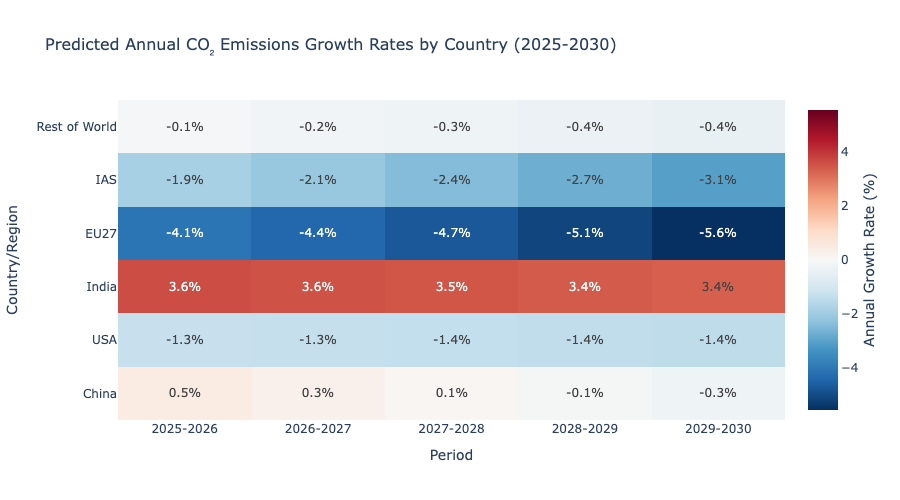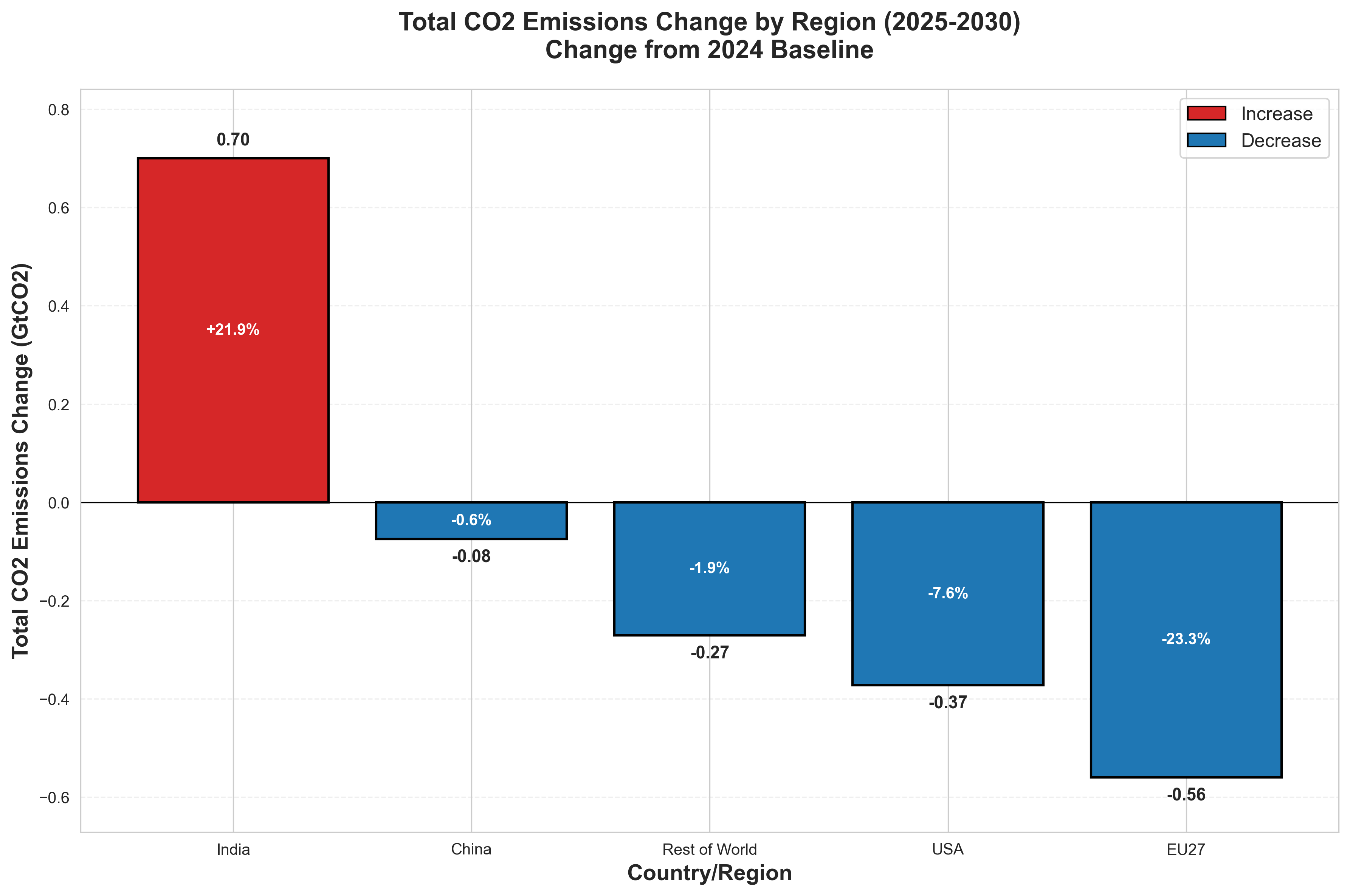 Combined reductions from the United States and EU27 total 0.93 GtCO₂ over the 2025-2030 period, more than offsetting India's growth of 0.70 GtCO₂ over the same period.