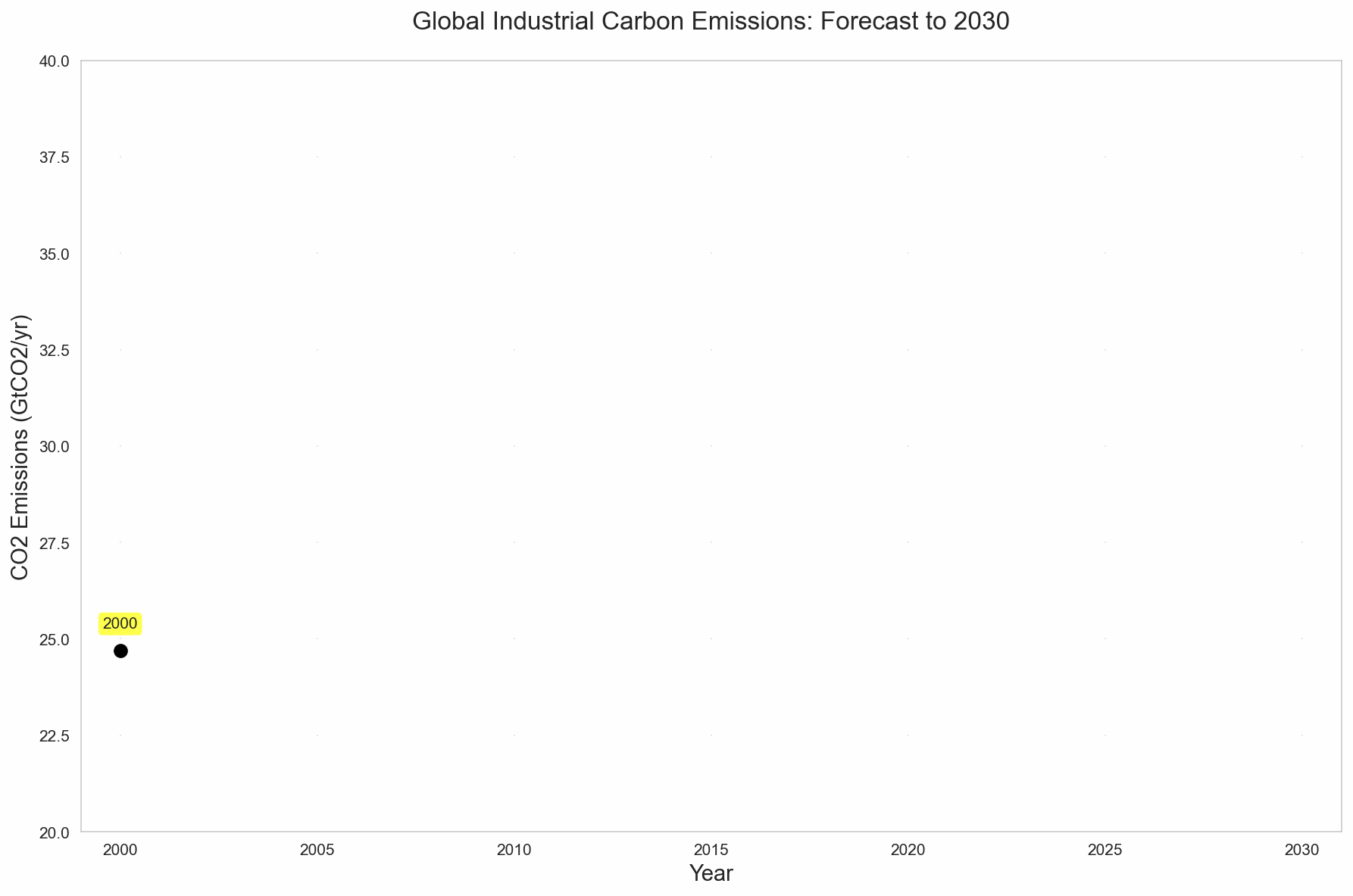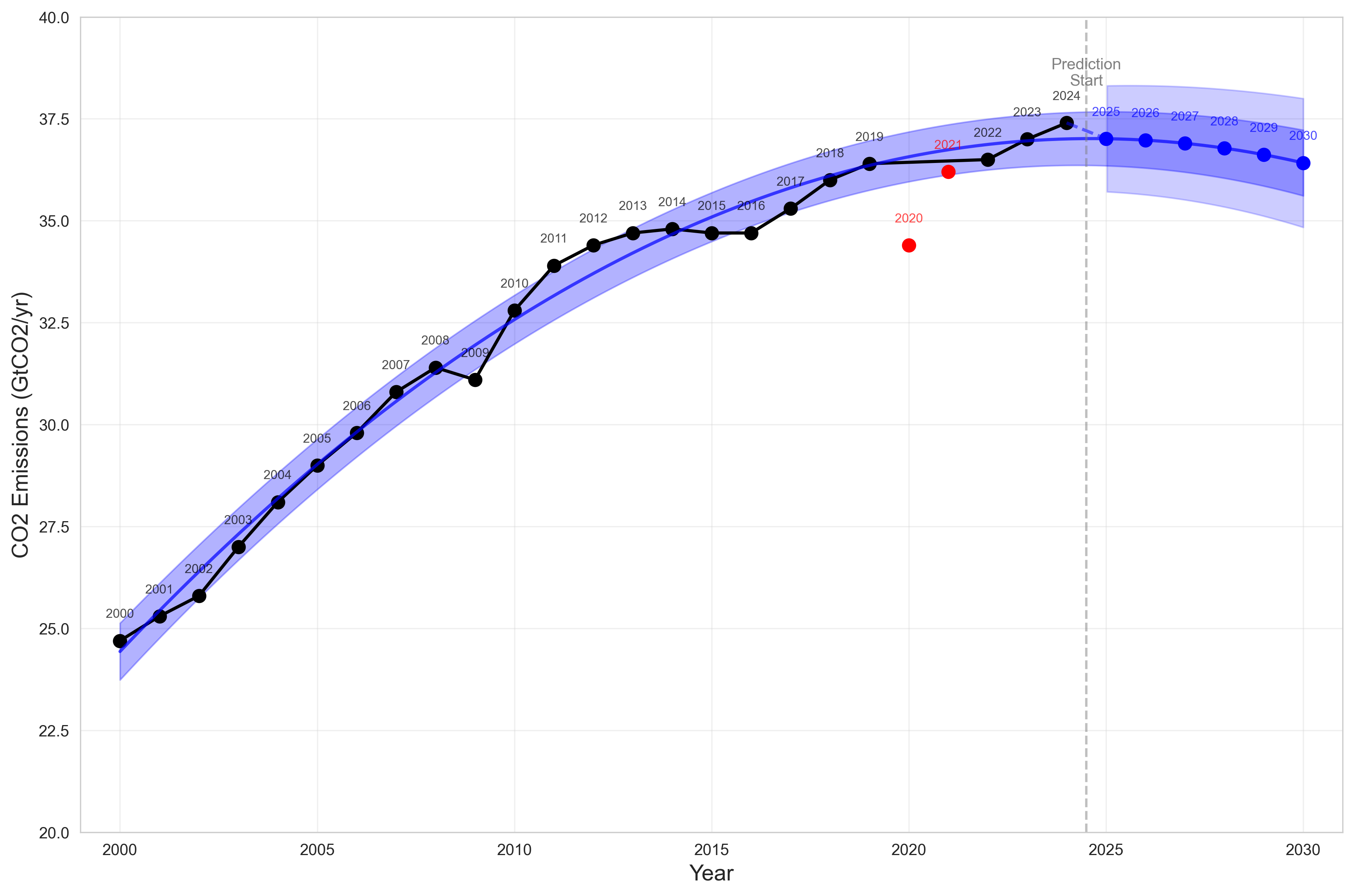 Using emissions since the year 2000 (excluding COVID years), I've applied a forecasting technique to project global industrial carbon emissions out to 2030 with the model capable of explaining 98.87% of the variance in CO₂ emissions data. NB: Detailed methodology is shown at the end of article