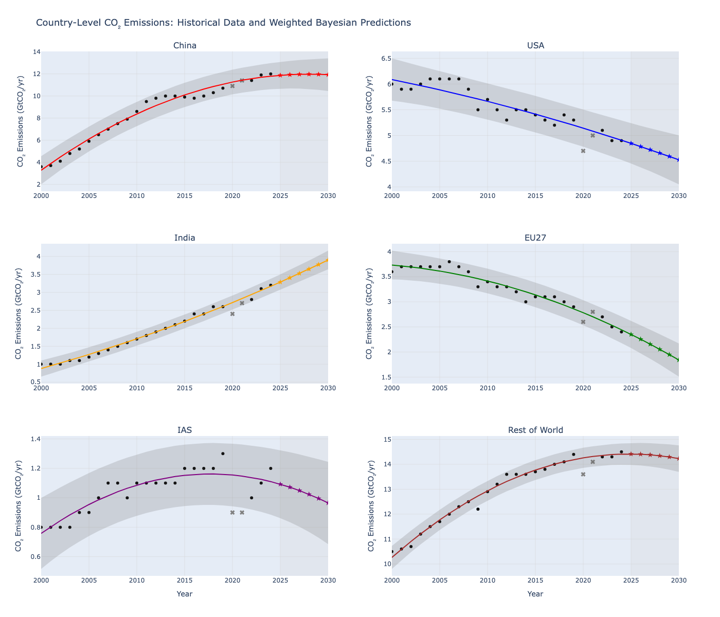 Each region is modeled separately using the same Bayesian Ridge methodology, then aggregated to produce global forecasts. This approach captures the distinct emission trajectories and policy environments across major economies.